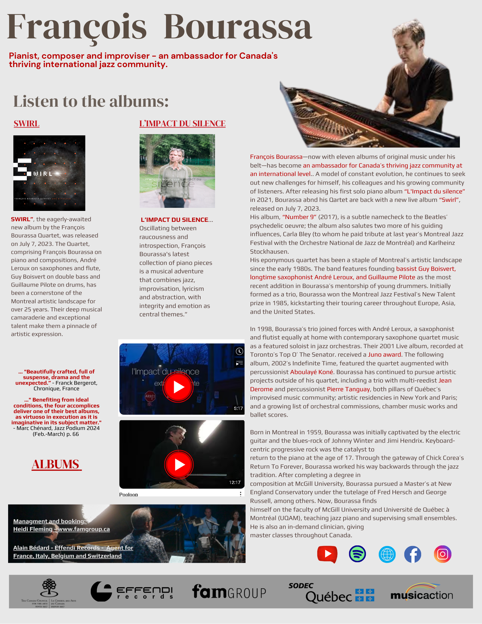 François Bourassa—now with ten albums of original music under his belt—has become an ambassador for Canada’s thriving jazz community at an international level. A paragon of both consistency and evolution, he continues to seek out new challenges for himself, his colleagues, and his growing community of listeners. On April 16, 2021, Bourassa finally released his first solo piano album L’Impact du silence, recorded at La Buissonne in the southeast of France. On July 7, 2023, he will release « Swirl », a new live album by the François Bourassa Quartet recorded in 2022 at Studio Piccolo in Montreal (QC)